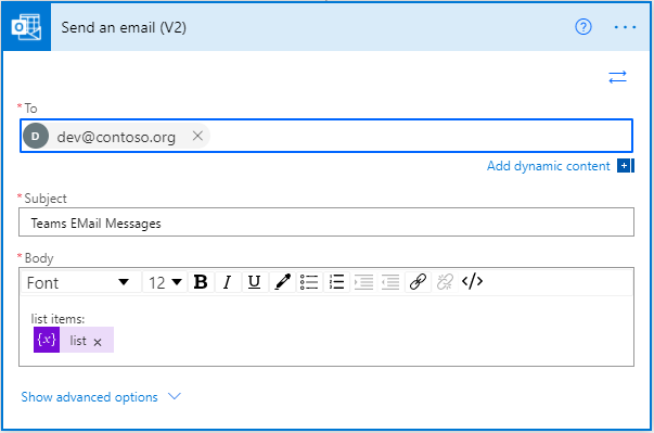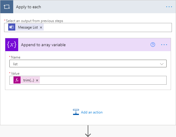 To access the messages, we use the control “Apply to each” where we use the output of the “Get messages” action, as here.