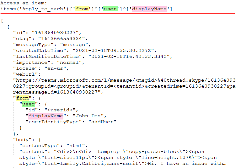 The “Get messages” shows the data. To access, let´s say, the displayName of the user who wrote the post, we can follow the path as shown below and use the following syntax in the loop: