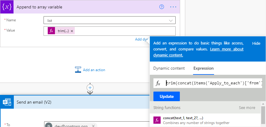 The “Append to array variable” action only allows to add a value, but fails if the expression is empty. If, for whatever reason, no value is existing, the action throws an error. To work around this, we can use a little trick an add a space and remove that with the trim function later. So, we can use such an expression to avoid any errors.