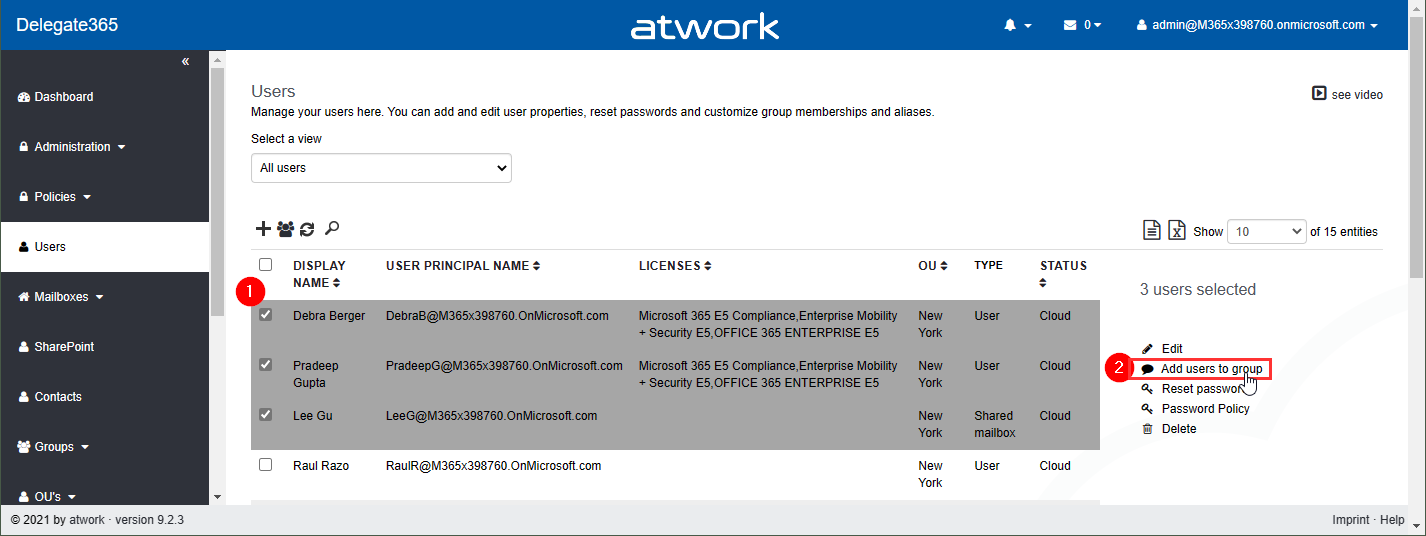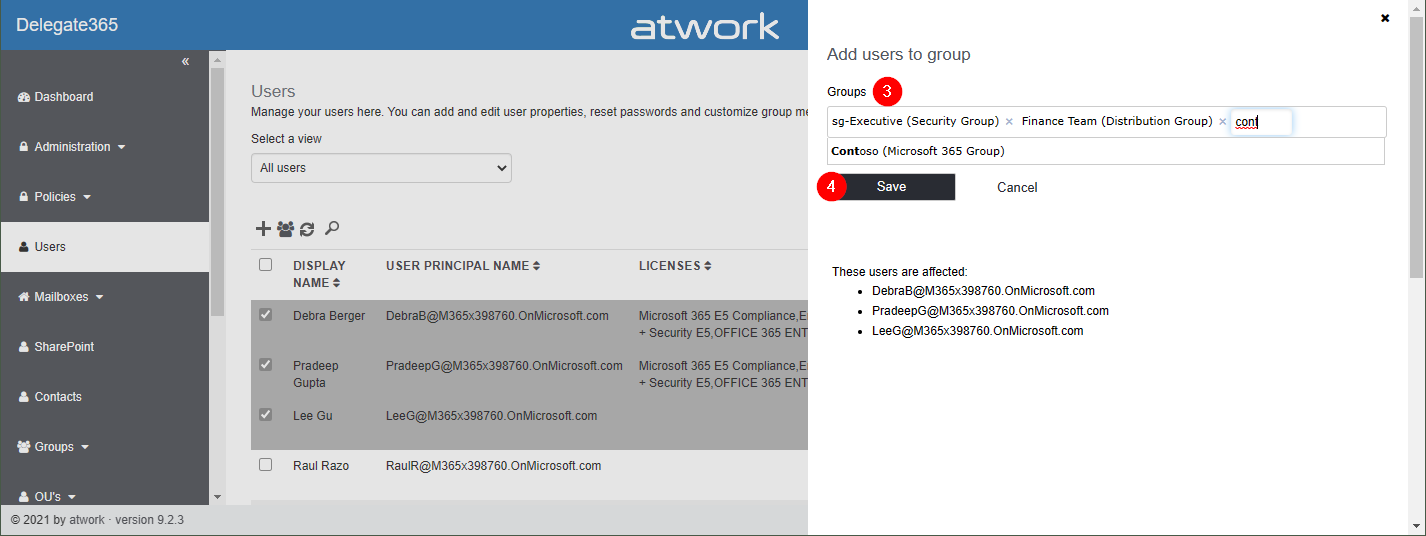 Bulk add users to groups: In the users list, select more than one user. The menu on the right then shows the new option “Add users to group”. In this sample, 3 users are selected: Debra, Pradeep and Lee.