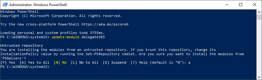If you don´t have v1.0.0.10 installed, update your Delegate365 PowerShell module, as follows.