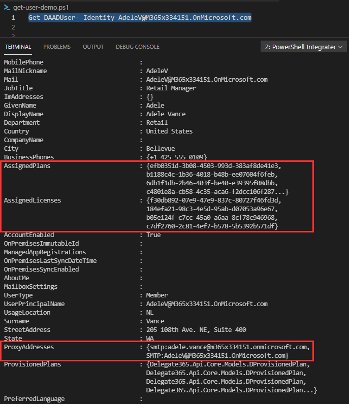 The output shows the AssignedPlans, AssignedLicenses and ProxyAddresses properties of that user as list objects.