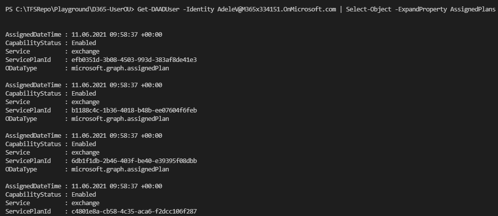 Get-DAADUser -Identity AdeleV@<tenant>.OnMicrosoft.com | Select-Object -ExpandProperty AssignedPlans