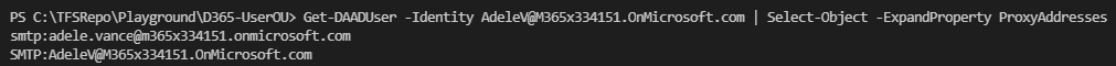 Get-DAADUser -Identity AdeleV@<tenant>.OnMicrosoft.com | Select-Object -ExpandProperty ProxyAddresses