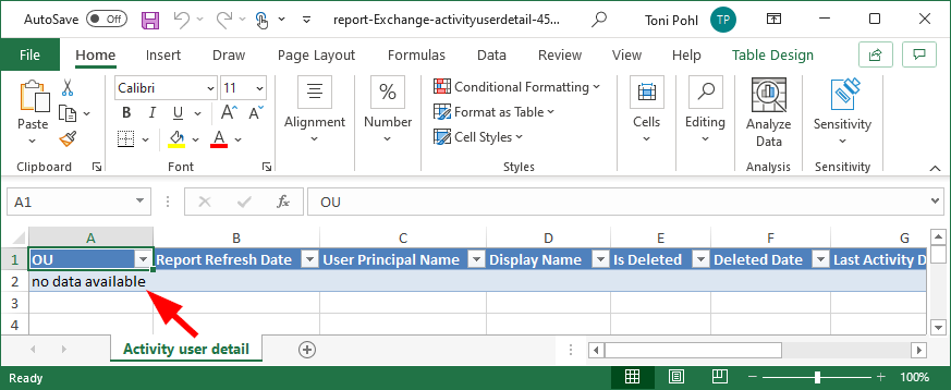 When the report is open and “no data available” is displayed (although you see users and groups in the Delegate365 pages)…
