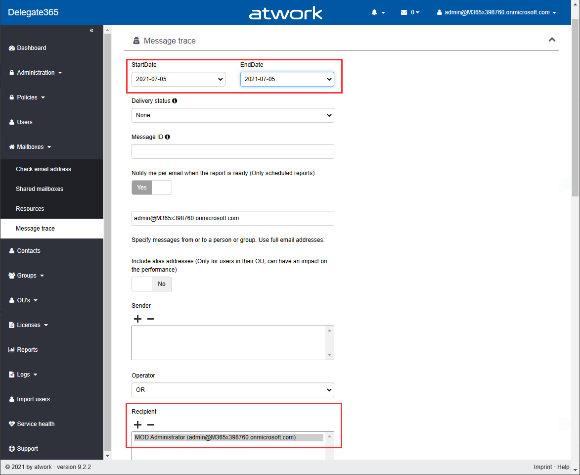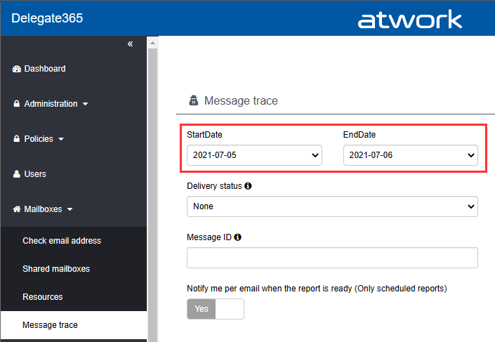 In Delegate365, admins can run a message trace to get information about the delivery status. When we run the message trace with the filter Startdate 2021-07-05 to Enddate 2021-07-05 - just this one day - and that user as recipient…