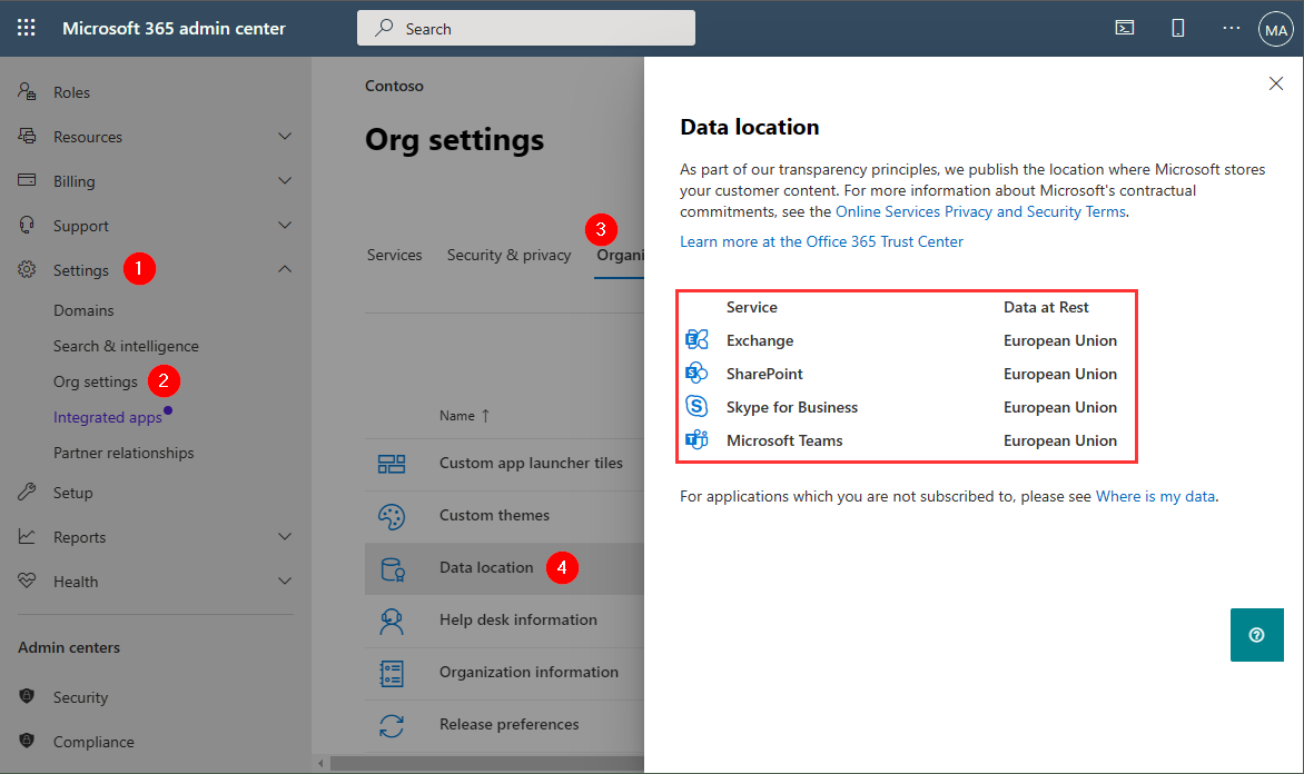 As a Global Admin, we can check the location of the Exchange Online servers in the Microsoft 365 admin center - Org settings.
