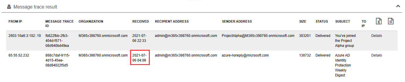 This is the reason, why different dates are shown, and why the message trace with the filter for one full day (2021-07-05) did not deliver that email(s).