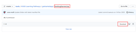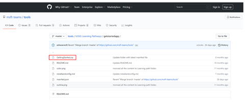 Melde dich für die folgenden Schritten als Globaler Administrator an: 1. Öffne den folgenden GitHub-Link: tools/M365 Learning Pathways/getstartedapp. 2. Klicke auf “Gettingstarted.zip”.