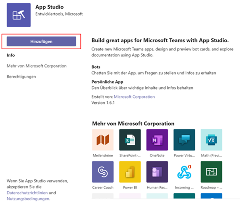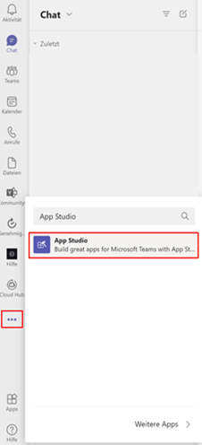 Wechsle zu Microsoft Teams und klicke unten links im Menüband auf die drei Punkte (“Weitere Optionen”). Suche nach “App Studio”.