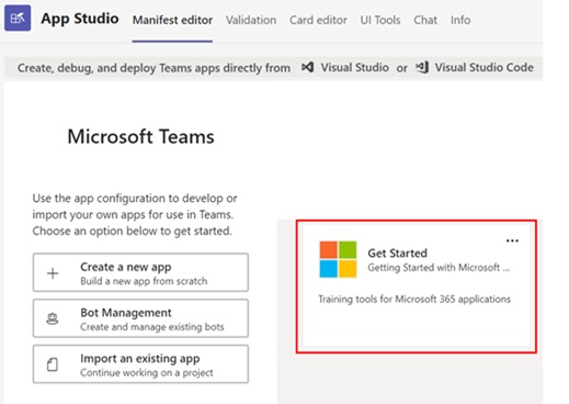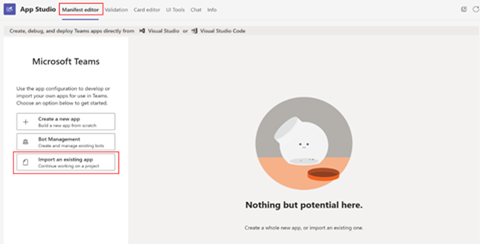 Nun öffnet sich “App Studio”. Klicke unter “Manifest Editor” auf “Import an existing app” (“Import von existierender App”).