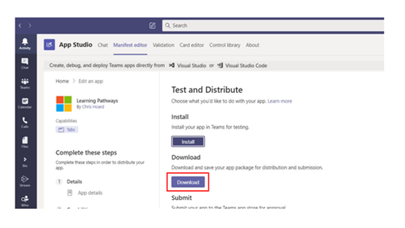 Nun verteilen wir dies an Microsoft Team. Wähle dazu im App Studio unter Manifest Editor die App “Learning Pathways” (wenn so benannt) aus und klicke unter „Test and distribute" (“Testen und verteilen”) auf „Download". Die Zip-File wird auf deinem lokalen Arbeitsgerät unter „Downloads" gespeichert.