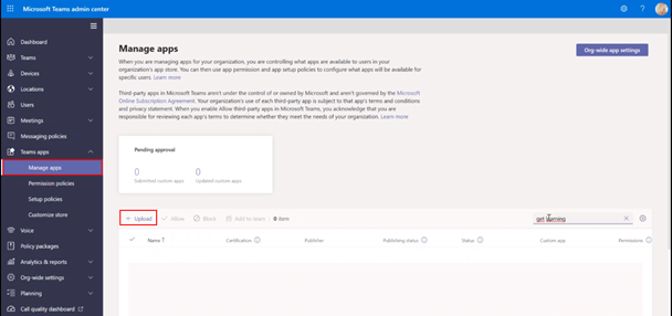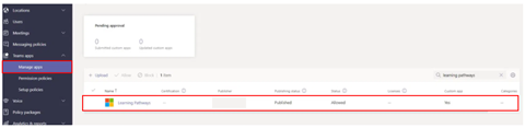 Wechsle ins Microsoft Teams Admin Center (https://admin.teams.microsoft.com) und klicke auf “Manage Apps”. Unter “Upload” kannst du die abgeänderte ZIP-Datei hochladen. Wenn die Datei erfolgreich hochgeladen wurde, wird es als erfolgreich markiert und du kannst dann in der App-Liste danach suchen. Warum? Lernpfade/Templates von Lookbook müssen auch in den App-Katalog hinzugefügt werden.