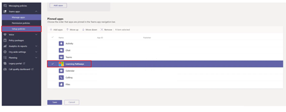 Klicke nun auf “Setup Policies”. Als Administrator hast du die Möglichkeit mithilfe von Richtlinien für die App-Einrichtung Microsoft Teams so anpassen, dass die Apps hervorgehoben werden, die für die Benutzer am wichtigsten sind. Wähle dazu die App (Beispiel: Learning Pathways) aus, die du im Menüband in Microsoft Teams anheften möchtest. Lege die Reihenfolge fest, in der sie in der App-Leiste angezeigt werden soll. Mit App-Setup-Richtlinien kannst du alle Apps präsentieren, die die Benutzer in deiner Organisation benötigen, unabhängig davon, ob sie von Microsoft, Partnern oder Ideinen Entwicklern erstellt wurde. Du kannst auch die App-Setup-Richtlinien verwenden, um zu verwalten, wie integrierte Funktionen innerhalb von Microsoft Teams für deine Organisation angezeigt werden sollen. Wichtig: Beachte, dass es einige Stunden dauern kann, bis die Änderungen übertragen werden, und dass sich die Benutzer möglicherweise ab- und anmelden müssen, damit die Änderungen wirksam werden.