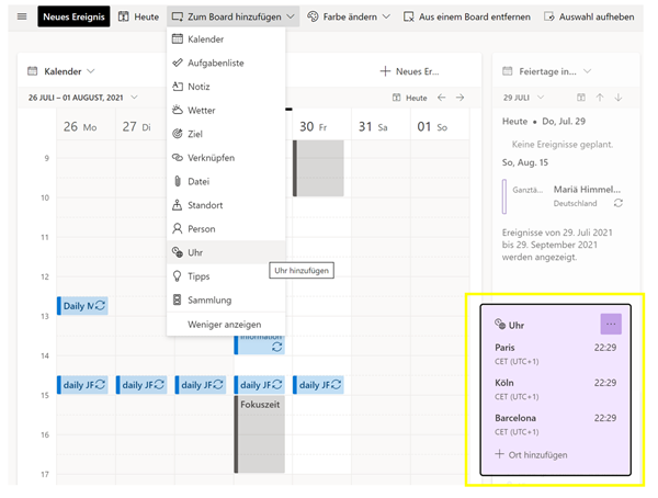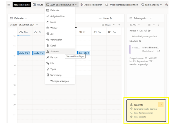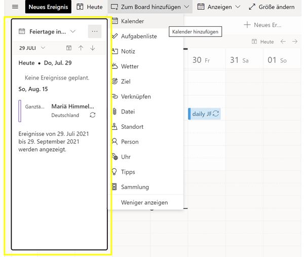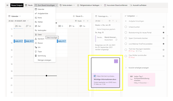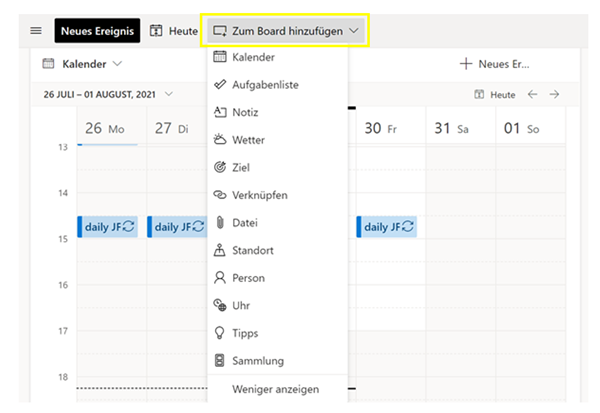 Das Hinzufügen eines Kalenders zum Kalender klingt zunächst eigenartig – warum also das Ganze? Bei der Planung eines internationalen Meetings oder eines Events ist das Hinzufügen eines Feiertagskalenders sinnvoll und eine gute Erinnerung. Daneben kann auch das Hinzufügen eines Gruppenkalenders aus deiner Microsoft 365-Gruppe helfen, deinen Tag und die jeweiligen Termine besser zu strukturieren und zu planen. Wähle dazu den Kalender unter “Zum Board hinzufügen aus”, und das Kalender-Widget wird deinem Board automatisch hinzugefügt. Danach kannst du auswählen, welchen Kalender du hinzufügen möchtest. Nun hast du die Möglichkeit die Größe des Widgets je nach gewählter Ansicht zu verändern und nach deinen Wünschen zu adaptieren. Tipp: Wenn du die Monats Ansicht auswählst, kann die Größe des Widgets nicht geändert sowie das Widget nicht umbenannt werden.