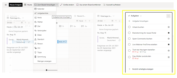 Für das Hinzufügen einer Aufgabenliste zu deinem Board gilt die gleiche Vorgehensweise wie beim Kalender. Klicke dazu wieder in der Drop-Down-Liste “Zum Board hinzufügen” auf “Aufgabenliste”. Danach wird die Liste automatisch zu deinem Board hinzugefügt. Du kannst somit die Aufgaben ganz einfach per Drag & Drop in deinen Kalender ziehen. Wie beim Kalender, hast du auch bei der Aufgabenliste die Möglichkeit die Größe des Widgets zu verändern und es nach deinen Wünschen zu verschieben.
