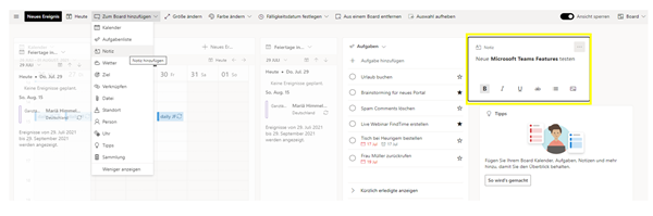 Das Hinzufügen einer Notiz erfolgt ebenfalls über “Zum Board hinzufügen”. Wenn dies erfolgt, hast du die Möglichkeit die Farbe des Widgets zu ändern und auch ein Fälligkeitsdatum der Notiz festzulegen.
