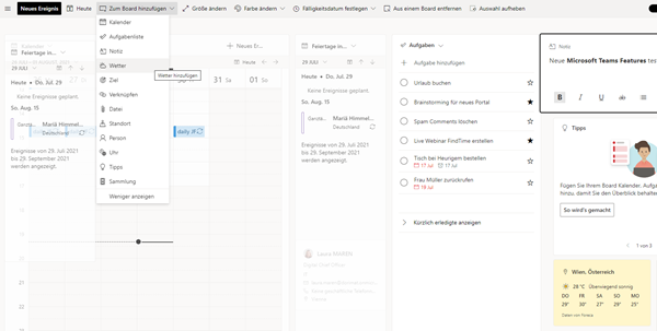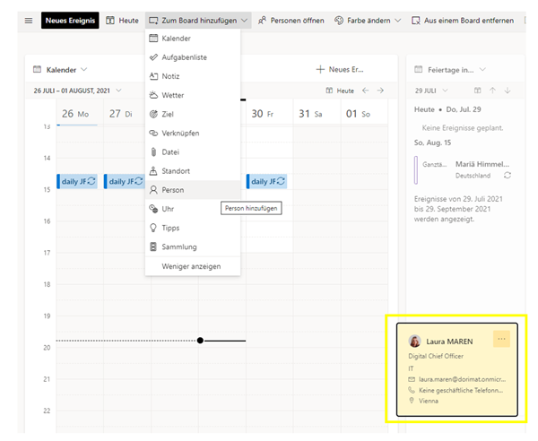 Je nachdem, was du in deinem Board vorhast, kann das Personen-Widget ein Schnellzugriffs Menü für deine Aufgaben sein. Da in unserem Beispiel Jessica des Öfteren Laura kontaktiert, ist es einfach, sie direkt zum Board hinzuzufügen, um mit ihr in Kontakt zu treten.