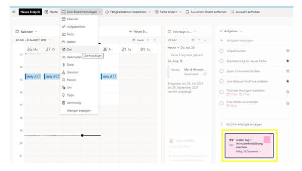 Damit ihr eure Aufgaben und Ereignisse noch besser verwalten könnt, gibt es eine neue Ansicht für Outlook – die Board Ansicht. Die Board Ansicht ist wie eine unendlich große Leinwand, auf der du Inhalte, wie Kalender, Aufgaben, Ziele, Links, Notizen und Dateien zusammenführen und strukturieren kannst.