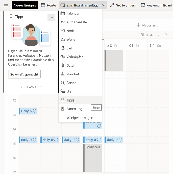 Die Outlook Kalender Board Ansicht hat auch ein Tipps-Widget, mit dem man Tastenkombinationen (Short-Cuts) und andere Tipps nachschlagen kann.