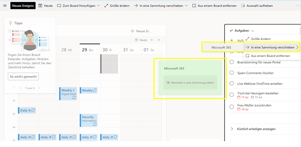 Da ein Board schnell überfüllt sein kann, existiert das Sammlung-Widget, das ein Container ist, in dem du Widgets sammeln kannst. In unserem Fall heißt unser Container “Microsoft 365” und wir können verschiedene Widgets, die zu dem Thema passen, wie z.B. unsere Aufgaben in die Sammlung “Microsoft365” verschieben, um dort alles an einem Ort zu sammeln und übersichtlicher zu gestalten.