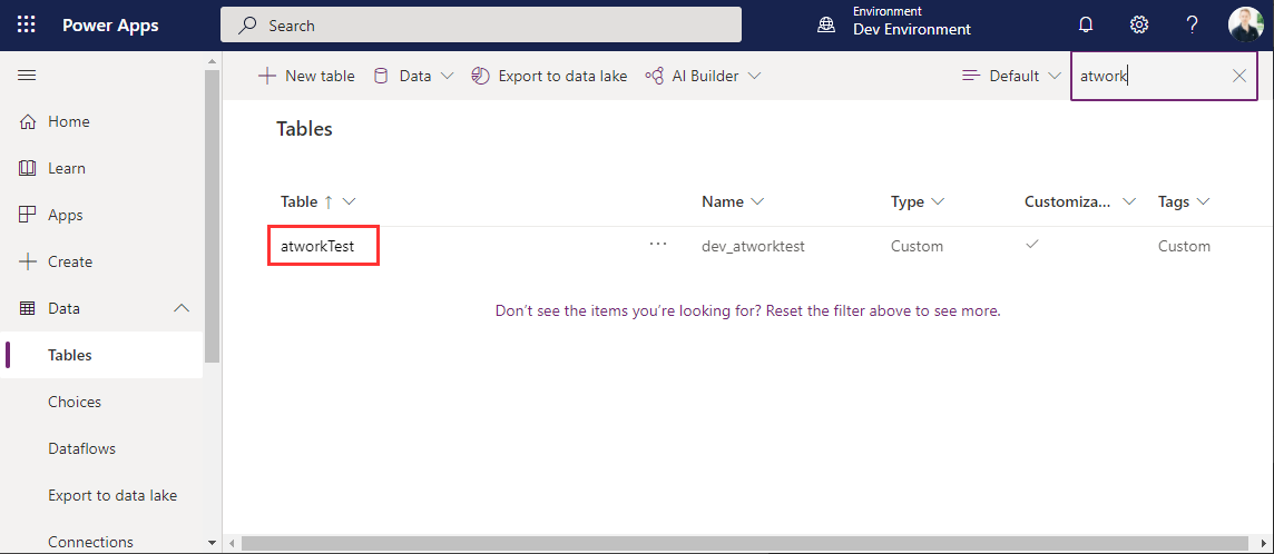To demonstrate how to set permissions, I switched to the environment (in my sample, it´s the “Dev environment”) and created a new table in the https://make.powerapps.com/environments/[environment-id]/entities / Data / Table menu. The table name here is atworktest with some text columns.