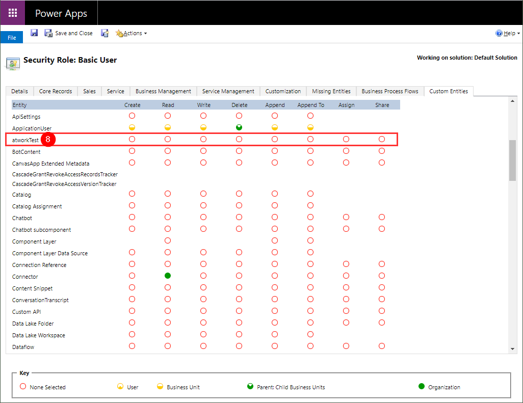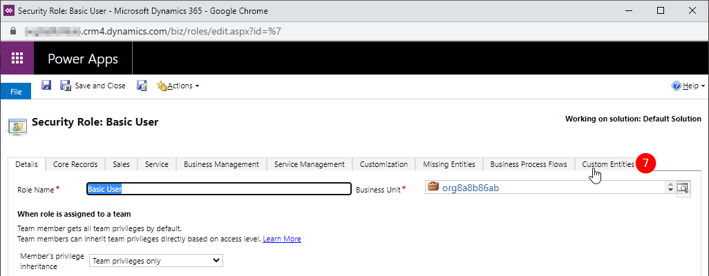 Here, we stay with the predefined role. Click on the Basic User security role. This opens a popup window where you can edit that role. Click on the tab Custom Entities here.