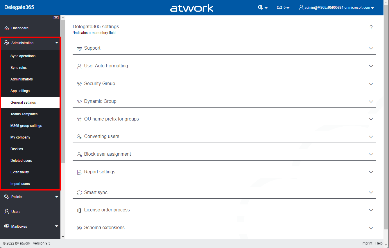 Restructured Administration menu: There is a new menu App settings, showing the apps used in Delegate365 (see below). The *General settings *have been reduced a bit and now contain the Delegate365 behavior settings. The menu Import users moved to Admin menu as a submenu.