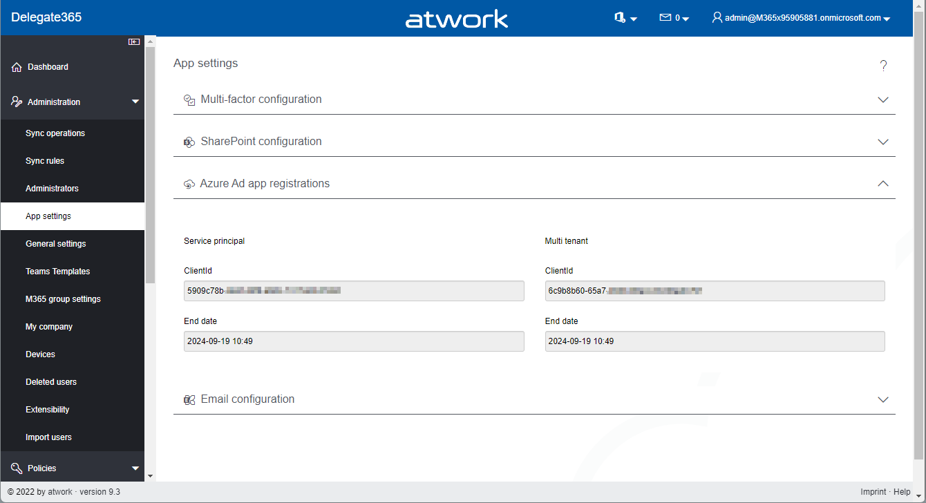 New App settings: This module shows the two Delegate365 Azure AD apps, the SharePoint App (see how to configure that here), the E-Mail account for sending emails, and the Multi Factor configuration section (see below).