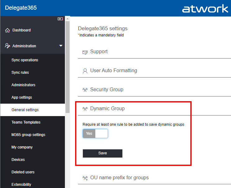 The Service Principal Name is used for all Delegate365 operations. The Multi Tenant app is used for the sign-in process and allows users from other M365 tenants to log in. The expiry date of the apps is also displayed. At the latest after the expiration, the app must be renewed by a setup. Any other apps with the name “Delegate 365” and different App-Id´s than here can be removed in the Azure AD.Dynamic Groups rule check: In Administration / General settings, there´s a new section named “Dynamic Group” including a switch “Require at least one rule to be added to save dynamic groups”. When set to Yes, a Dynamic Group must contain at least one rule. This switch prevents accidentally creating such a group without any rule and creating a group that, for example, sends emails to all users in the organization. This applies to all groups that are created or edited in Delegate365 from now on. The default is set to No.