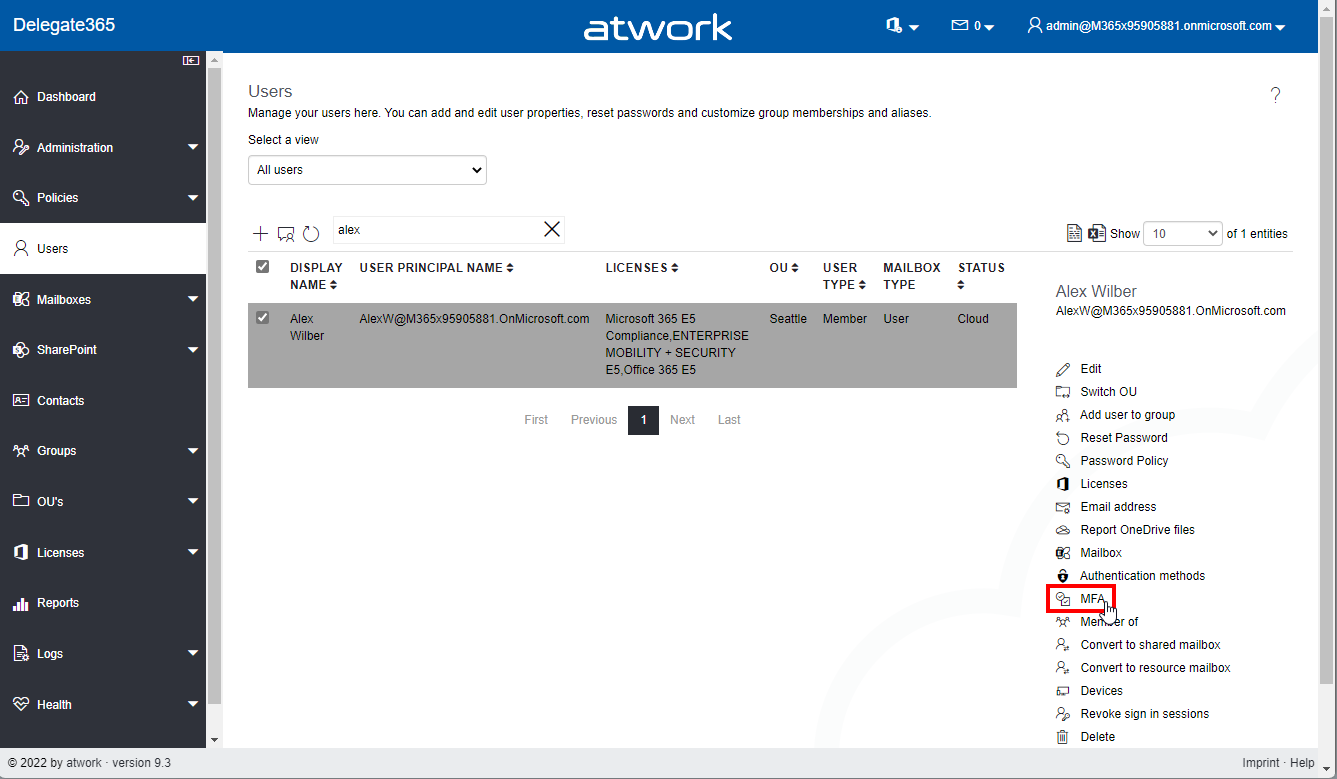 Multi Factor configuration (backwards compatibility): This feature in the Users menu is for backwards compatibility and we recommend disabling it as described below. The reason is, that Delegate365 is dependent on the Microsoft API’s and there is currently no replacement for using the MFA capabilities with Modern Authentication. As a replacement, Microsoft recommends using Conditional Access and Rules for MFA. However, the MFA feature still exists in the Users module. This allows MFA to be set to *Enforced, Enabled, *or Disabled for a user.