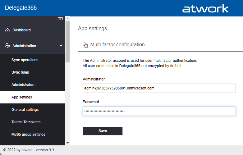 If your organization really needs this MFA feature in Delegate365, you still need to add a non-MFA service account. You can do so in the Administration / App settings menu in the Multi-factor configuration page. Add the service account and the password needed only for this feature and click Save, as here.