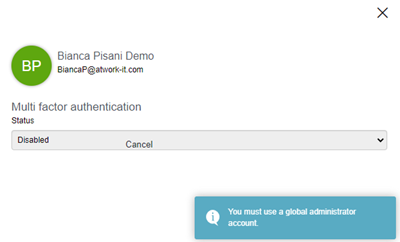 As mentioned above, we recommend disabling this feature for all admins by simply leaving these fields blank. When the MFA feature is then selected, a notification informs that the feature is not available, as here.