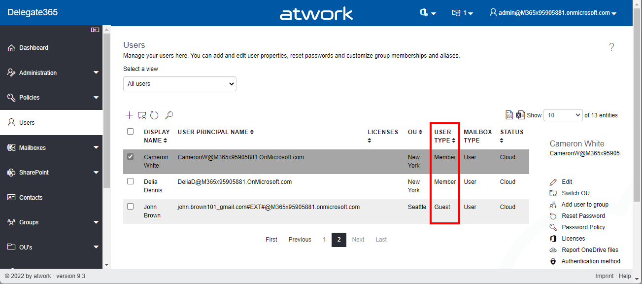Alternatively, the module can of course also be deactivated in the Permission Policies menu so that it is no longer displayed in the menu.Users / User Type: A new column informs about the user type (Member, Guest, or Undefined).
