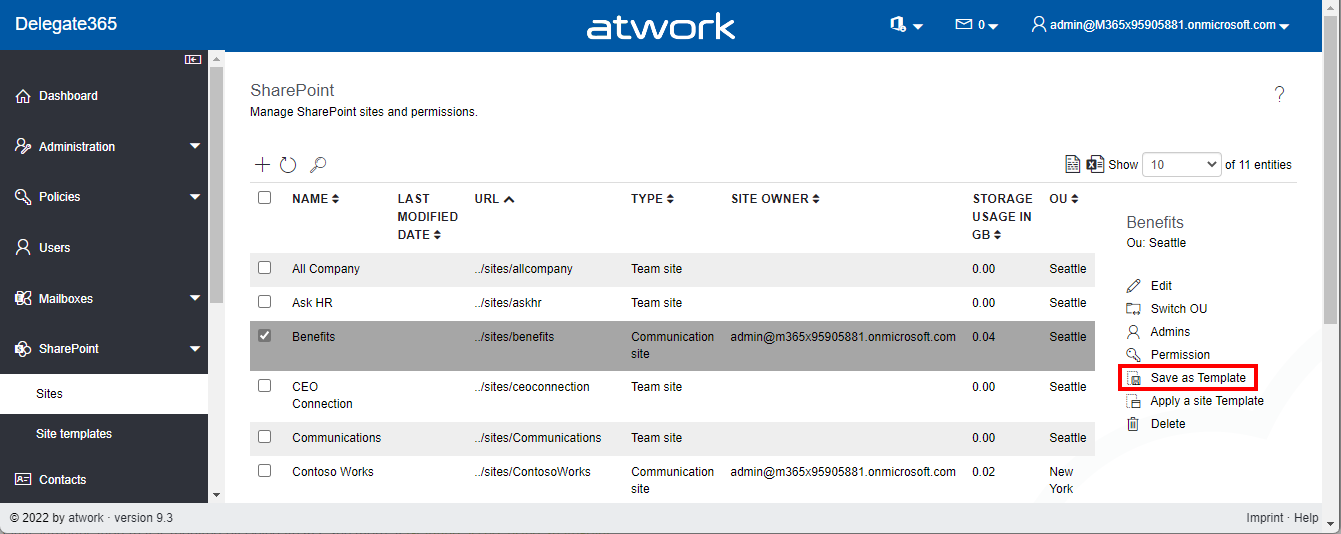 Save a SharePoint Template (new): To create or update an existing SharePoint Online site to a specific template, you can now add such templates to Delegate365. When a SharePoint site is selected in the SharePoint / Sites menu, select the Save as Template option in the right menu.
