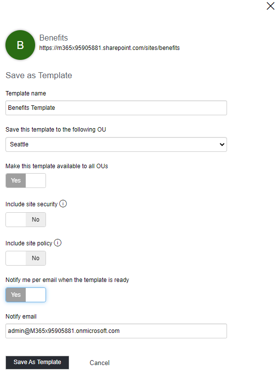 In the side panel, the template name, and the options can be set. By default, the saved template is only available for the selected OU. Alternatively, a template can also be saved for use in all OUs.