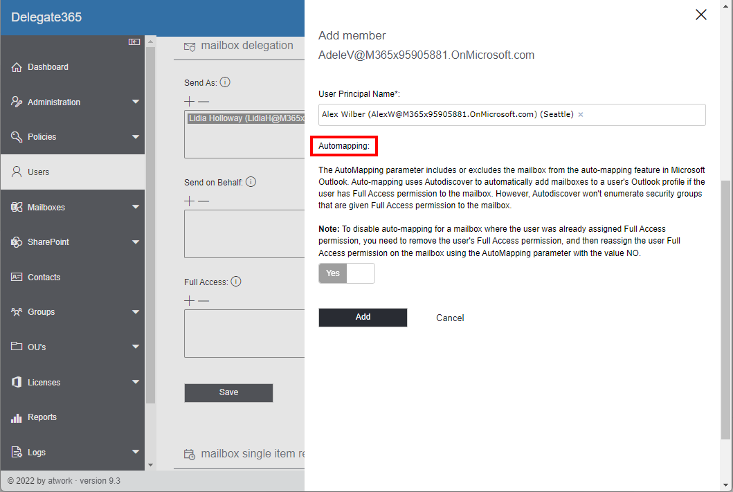 Mailbox Full Access Automapping: A new switch was added to the Full Access permission of a user´s mailbox. The AutoMapping parameter includes or excludes the mailbox from the auto-mapping feature in Microsoft Outlook. Auto-mapping uses Autodiscover to automatically add mailboxes to a user’s Outlook profile if the user has Full Access permission to the mailbox. By default, this switch is set to Yes.