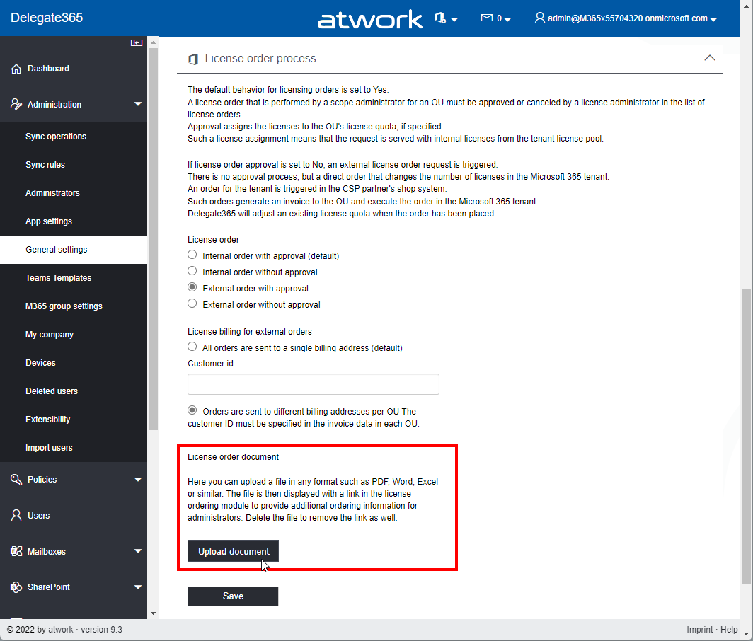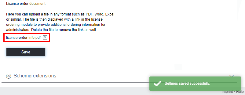 Upload a document: As Portal Admin, open Administration / General settings and scroll down to the License order process section. The document part for the license order is integrated here. The file can be any file in any format such as PDF, Word, Excel or similar. One file can be uploaded, not multiple files.