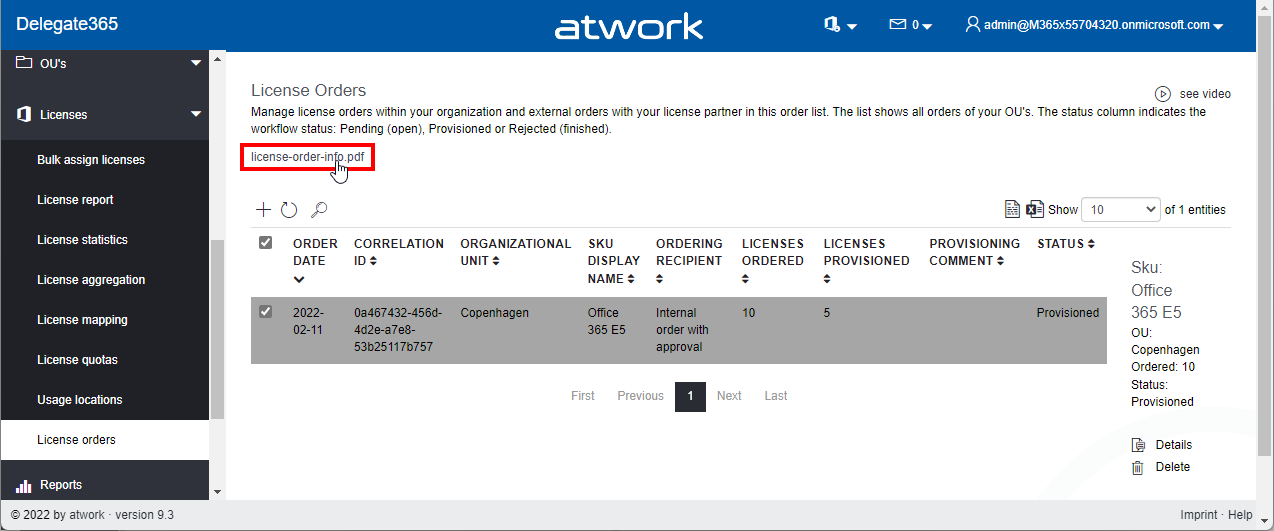 In this sample, a document license-order-info.pdf has been uploaded. The file is stored in the Delegate365 Azure Storage (and could be accessed in the storage directly as well).Remove a license order document: To remove such a file, click on the small *X-*icon to the right of the filename. This deletes the file from the storage and removes the link in the license order module.