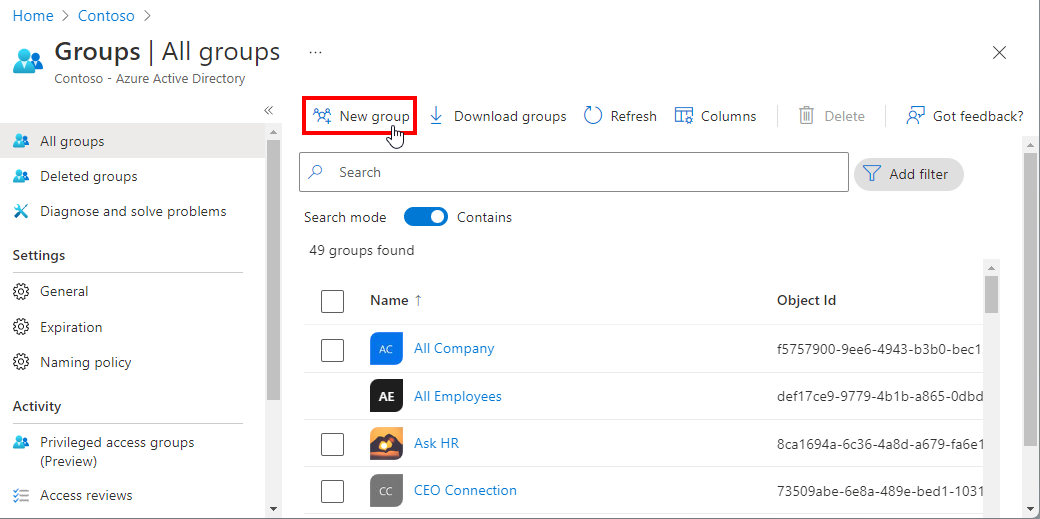First, we create a new Dynamic Group in the Azure portal in the Azure Active Directory of the M365 tenant. Open Azure Active Directory, and navigate to Groups. We click on New group, as here.