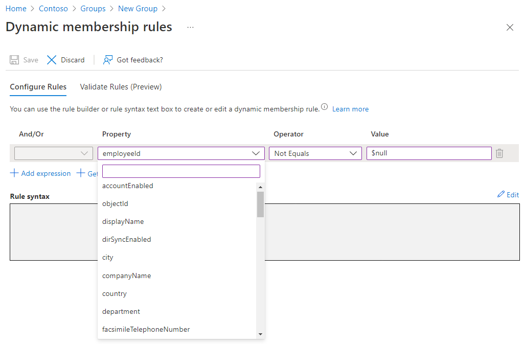 We can use the $null for almost all user properties, like (user.extensionAttribute1 -eq “$null”), and of course, direct expressions like* user.department -eq “IT”, regular expressions like user.displayName -match “ch.”, etc. You can find a list for the rule syntax and samples at Dynamic membership rules for groups in Azure Active Directory.