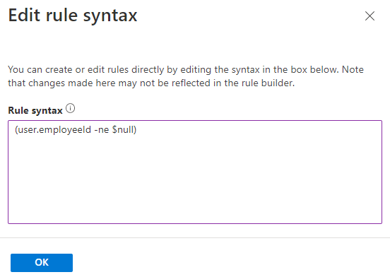 Since this is a special case here with the comparison of $null - we only want users who have any value in the EmployeeId property - we need to modify the rule syntax by clicking on the Edit link. We need to remove the quotes here. The expression should be like this: