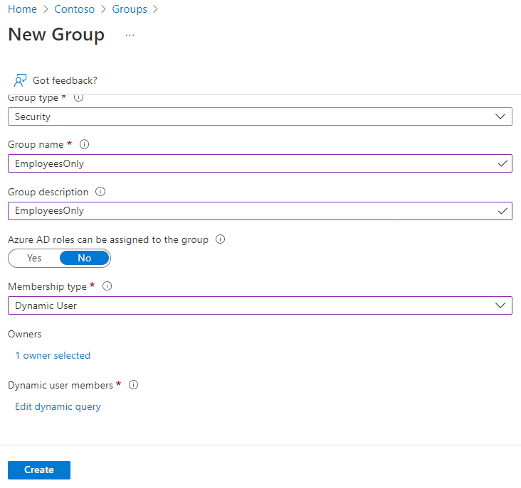 We select Group type Security, assign a name (here: EmployeesOnly), and select Membership type Dynamic User.
