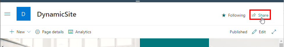 Now we open the SharePoint site, and click on the Share link on the top right corner.