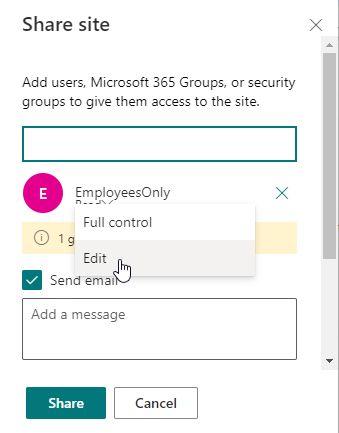 Then, we define what permissions the group members shall get in that site. If necessary, we change the permission to Edit.