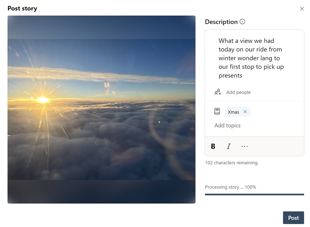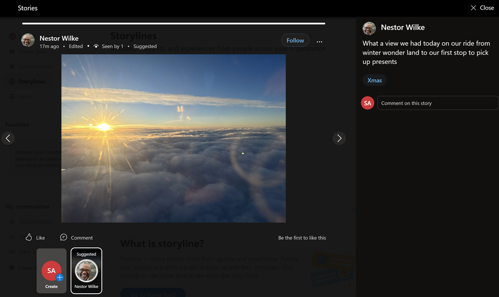 Our use case happens in Winter wonderland, where Santa organizes this years Christmas time deliveries. Since a couple of years they use Yammer to share knowledge within communities, like communities for the best presents for children, communities for work security where they share best practices how to navigate a sleigh and how not to fall through an chimney. This year, with Viva Engage stories and storylines Santa, the elfs and the reindeers started using stories to instant post short videos or beautiful pictures about their travel experiences around the world. The use case is simple: give an insight of your current experience, share short information, let people know what happens right now.