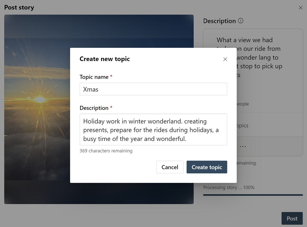 A Story does not necessary be related to a community, it can be something where people, regardless if leadership or anyone else share what’s currently important – maybe in a short period of time. To post a story you use Videos or pictures and post them. People who follow you can see them and even get a notification when you post something (if that feature is turned on). Ypu can also add Topics to the story and this makes it a great tool to be integrated.