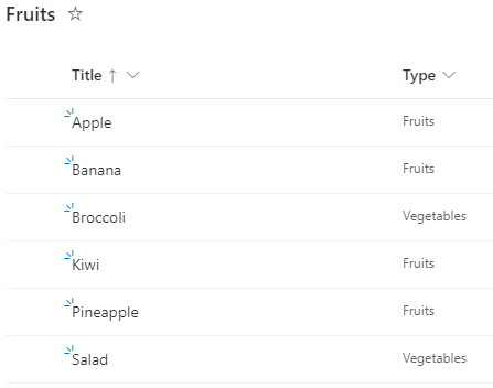 In this small sample, I will show how you can use a data table with the group by function to visualize a summary with a chart in a Power App. The data source is minimal: It´s a SharePoint list named Fruits, containing some items. The Type column is what we want to see grouped by the number of items.