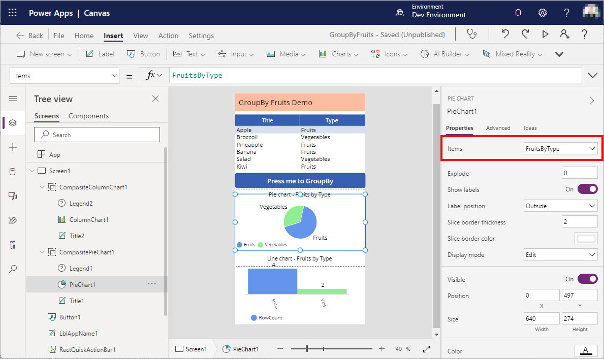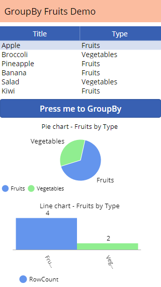 The desired outcome is to get a graphics that shows the products per Type. A datatable control shows the data that is bound to the Power App. Below, there is a button with a formula, a pie chart and a line chart control, as here.