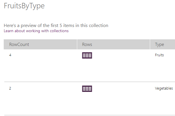 The trick here is to create a grouped table Rows, and use that table to add the column RowCount with the aggregate function to the collection. It took me some time to figure that out since I did not find such a sample in the official documentation. However, when the button is pressed, the FruitsByType collection is created (and overwritten if it already existed) and filled with the expression. In the Collections menu, we see the following table: